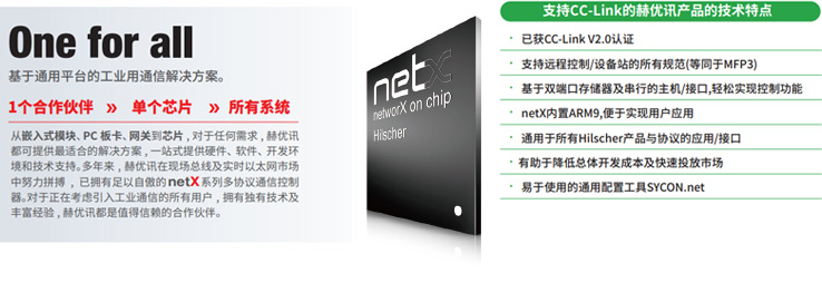 為兼容所有的自動化設備(驅動器、I/O、PLC、條碼掃描器等),赫優訊研發了多種多協議網絡控制器,以此構成了netX 系列。netX芯片搭載了ARM9CPU,并內置多種外設功能,實現了單臺硬件設備即可支持諸多協議,如主流現場總線及工業實時、以太網協議等。可借助赫優訊提供的固件版本設計用戶自己的CC-Link接口。